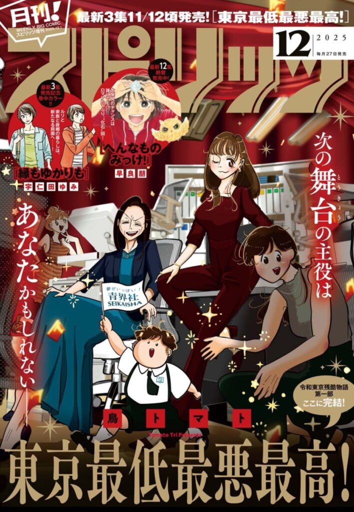 「東京最低最悪最高!」3巻が11月12日に発売になります。 最終話が載っている月刊!スピリッツは表紙も描かせていただきました。 3巻までで第一部は一旦休憩☕️ということになっております。 この漫画は2023年9月掲載された読切が、2024年夏から連載化したものです。 長いようで短い時間でした。月スピさんは本当に上品で懐の広い雑誌でした。本当にありがとうございました。 月スピに寄稿した著者コメントをもって第一部結びのご挨拶とさせていただきます。 Post Views: 129